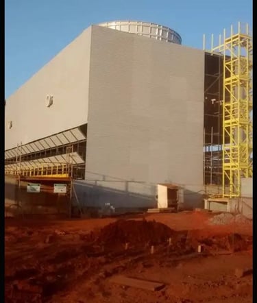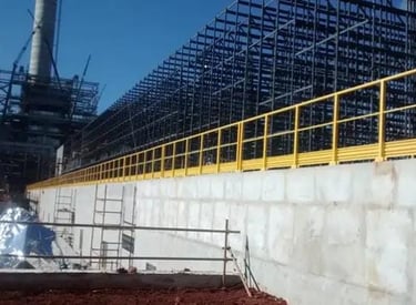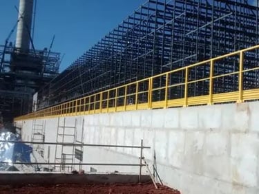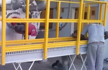 Perfis pultrudado em fibra de vidro PRFV sendo utilizado como estrutura e guarda corpo em uma torre de resfriamento. Perfis duráveis, resistente a corrosão, leves e duráveis.